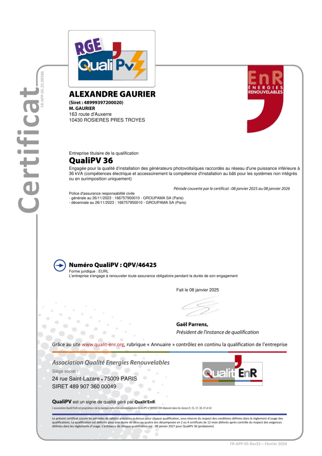 Nous sommes titulaires de la QualiPV 36 et de la QualiPV 500.